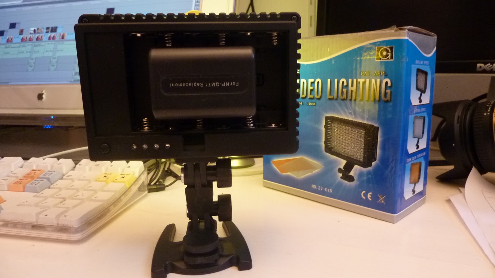 Er zit een grote dimmerknop op en, waar ik erg blij mee ben, je hebt niet alleen de mogelijkheid om Sony NPF-serie batterijen te gebruiken, zoals bij de Z96, maar je kunt ook oa grote Panasonic batterijen gebruiken. Ik heb ontdekt dat een Sony kloon van een oud mini-dv cameraatje nu ook weer nut heeft! Je kunt natuurlijk ook AA's gebruiken. Er zit een knopje en vier kleine lampjes achterop de behuizing waarmee je de capaciteit zou kunnen meten.